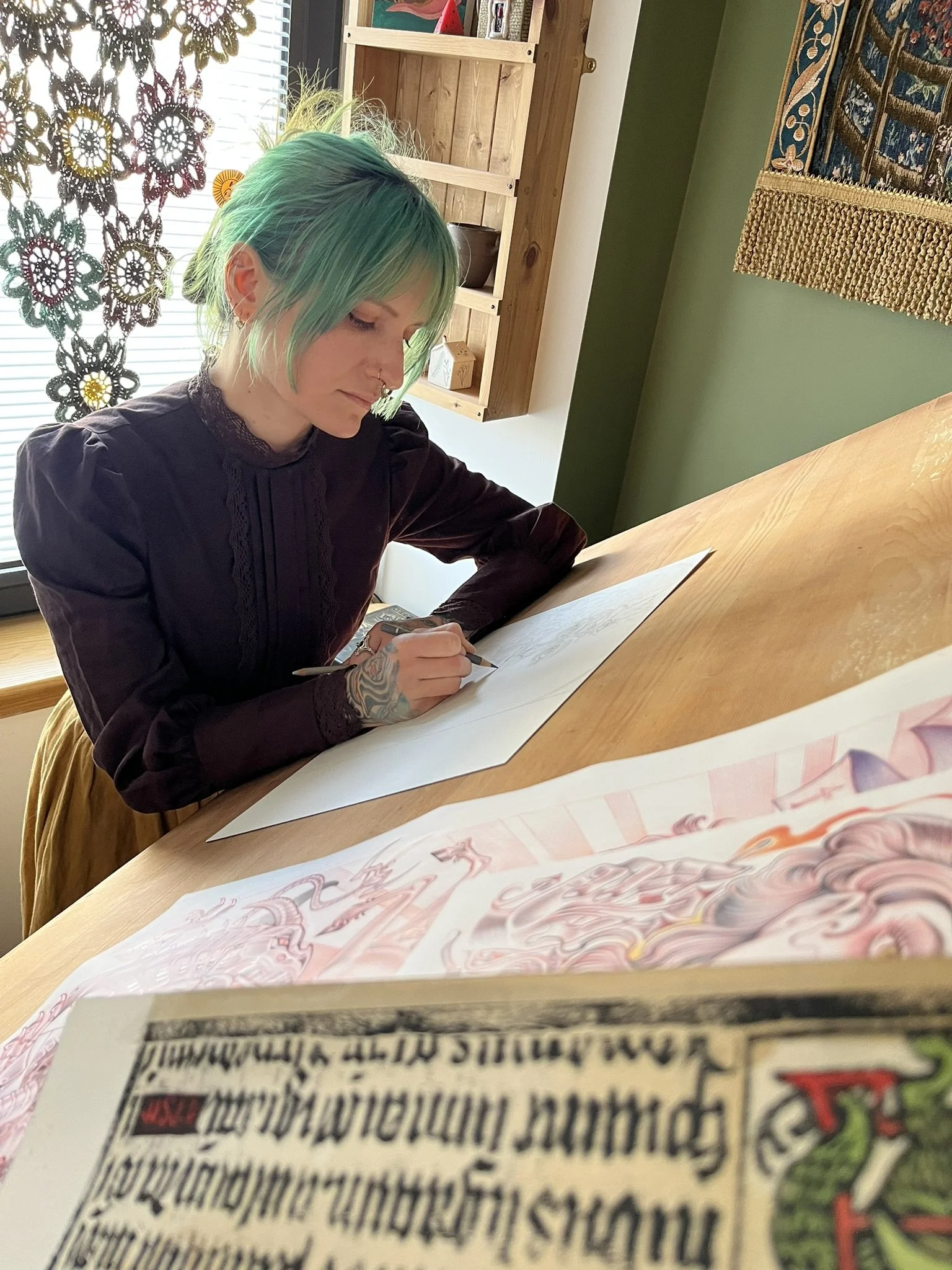 My name is Gabriela Monika but I go by Gabbie. Vasquez is an art name I’ve found myself stuck with (not that there is anything wrong with it) after using it everywhere I could get away with not using my real surname since I was a teenager. It was borrowed from my favourite at the time (and still one of the favourite) graphic novel artists, Jhonen Vasquez. I really wanted to do something art related since early age, just didn’t know exactly what yet and haven’t quite developed a style at the time. I wanted to go to art school, but my somewhat practical and insecure self, feared I should do something a bit more… realistic? practical? in my academic endeavours. So I graduated from a Graphic Design high school in Faenza, Italy, and then moved to Scotland, which I love and thanks to wonderfully welcoming people here, consider home. Here I graduated from Game Art and Animation course in Caledonian University in Glasgow. Eager to be done with school, I didn’t bother with any post graduate courses and threw myself into the madness of apprenticeship and tattooing.